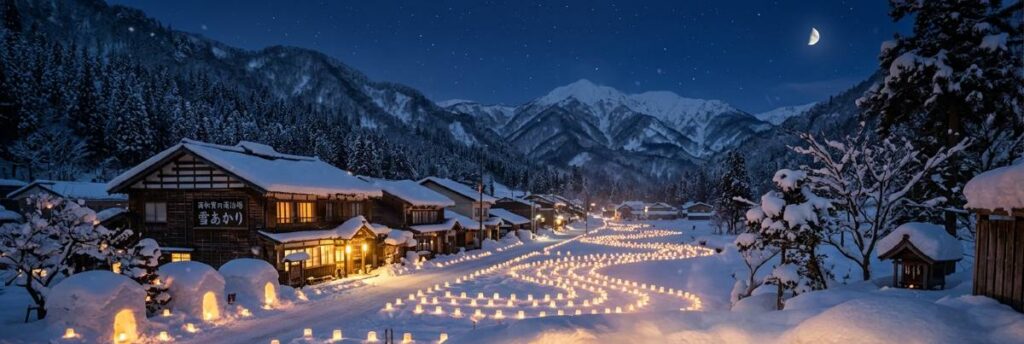 夜の帳が下りると、静寂に包まれた雪原に無数のキャンドルが灯されます。これが西和賀の「雪あかり」です。雪で作られた小さなドームの中に揺らめく炎は、単に美しいだけではありません。それは、凍てつく闇という巨大なキャンバスに描かれた、人間と自然の対話です。農場の雪まつりが持っていた「団結」の精神は、この光の連鎖へと引き継がれ、訪れる者の心を温かく照らし出します。この光景は、豪雪こそがこの地における最大の芸術素材であることを証明しているのです。
